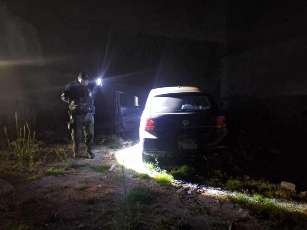 Siendo las 22:55 horas se logra visualizar un vehículo con mismas características y placas de circulación referidas por el reportante al interior de una construcción, motivo por el cual acude el propietario para corroborar que sea el vehículo qué momentos antes le habían despojado, quien confirma que sí es su vehículo.