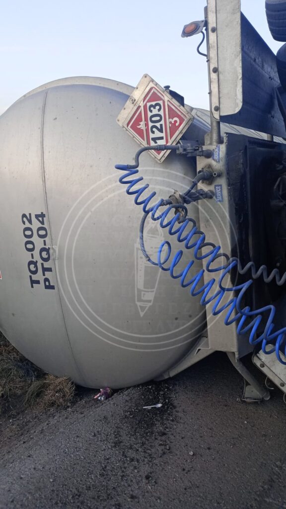 Se espera la llegada de un autotanque para realizar el trasciego de la gasolina y evitar cualquier riesgo de incendio o explosión. La pipa volcada ha causado un riesgo de combustible en la zona, por lo que se ha cerrado la pista en ambos sentidos.