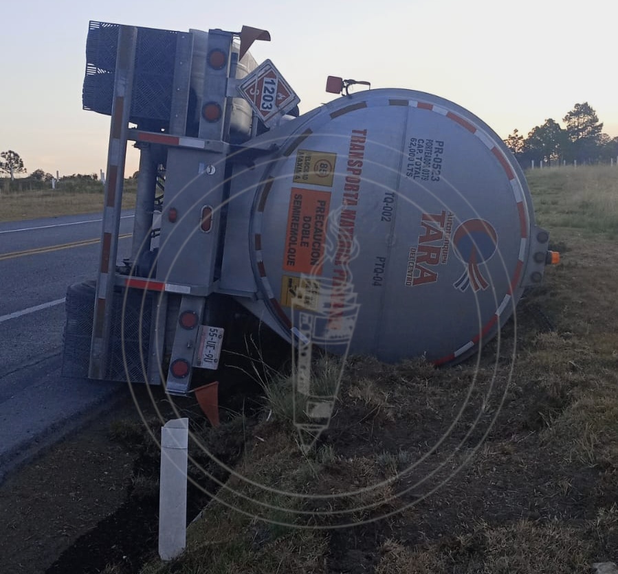 Una pipa que transportaba gasolina volcó en la carretera Perote-Amozoc, km 21+500, durante esta tarde-noche, causando el cierre de la autopista en ambos sentidos. El accidente ocurrió en el tramo de la caseta de Cuapiaxtla y no se reportan personas lesionadas.
