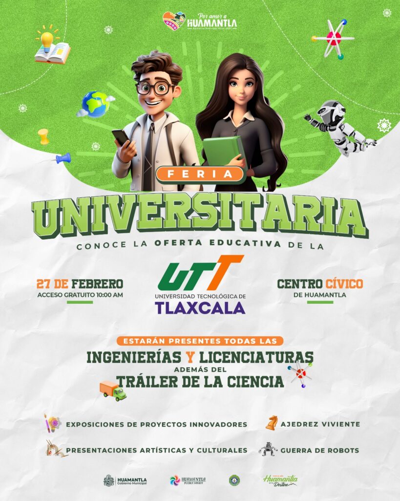 El Gobierno de Huamantla extiende una cordial invitación a toda la juventud del municipio y sus alrededores para asistir a la feria organizada por la Universidad Tecnológica de Tlaxcala (UTT), la cual se llevará a cabo el próximo jueves 27 de febrero de 2025, a partir de la 10:00 horas, en el Centro Cívico de Huamantla.
