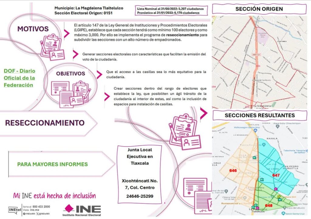 Con el objetivo de generar secciones electorales que faciliten la emisión del voto y que el acceso a las casillas sea lo más equitativo para la ciudadanía, el Instituto Nacional Electoral (INE) anunció el reseccionamiento de la sección electoral 151 perteneciente al Municipio de La Magdalena Tlaltelulco, dividiéndose en tres nuevas secciones que serán: 646, 647 y 648.