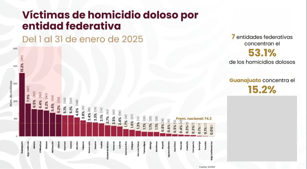 En el reporte, se identifica que los estados con menos homicidios dolosos en el país, en el periodo del 01 al 31 de enero de 2025, fueron: Baja California Sur (uno), Yucatán (dos), Durango (tres), Campeche (siete), Coahuila (ocho) y Tlaxcala (10).