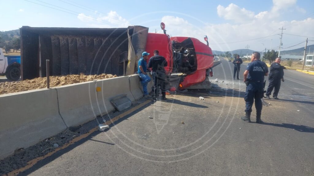 Un camión de volteo cargado con tepetate se volcó en la carretera Mena-Ciudad Industrial Xicohténcatl I, a la altura de la comunidad de Plan de Ayala, en el municipio de Tetla, durante esta tarde.