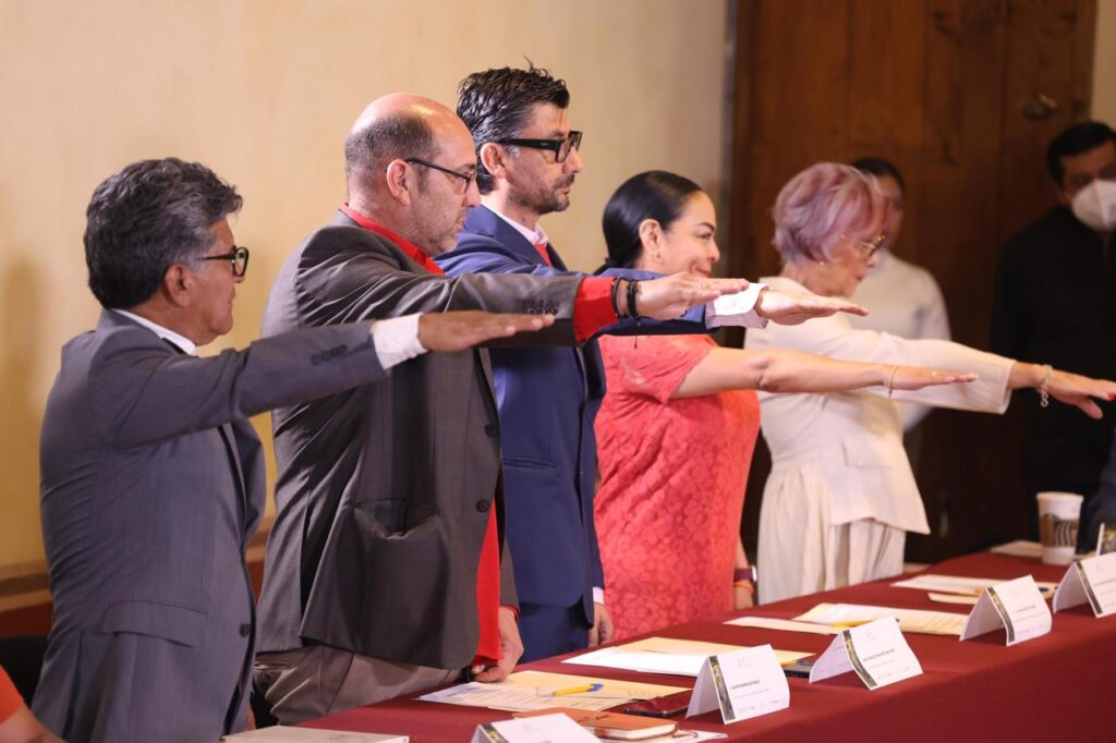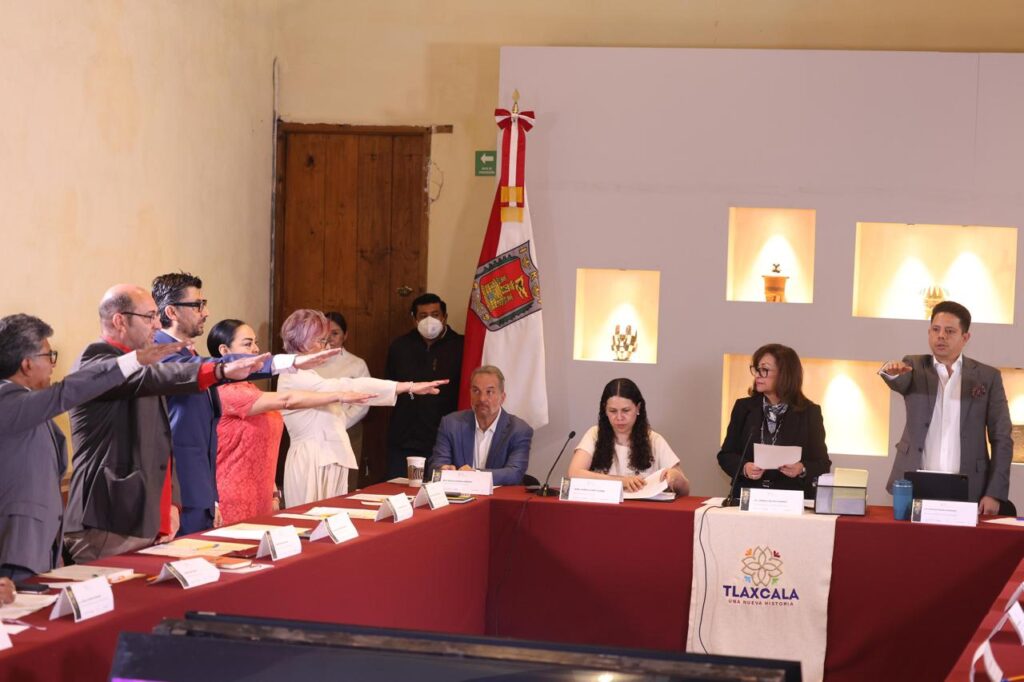 En su calidad de presidenta del Consejo, la mandataria estatal tomó protesta a José Vicente de la Rosa Herrera, director del Centro del Instituto Nacional de Antropología e Historia (INAH), como secretario técnico; a Magali Cruces Arteaga, directora de Patrimonio de SC; Mayra Vázquez Velázquez, directora del Archivo General e Histórico del Estado de Tlaxcala, y a Francisco Martínez Hernández, titular del Museo de la Memoria, como nuevos consejeros del Consafran, a quienes instó a cumplir con las responsabilidades establecidas en el decreto y reglamento interno del patrimonio.