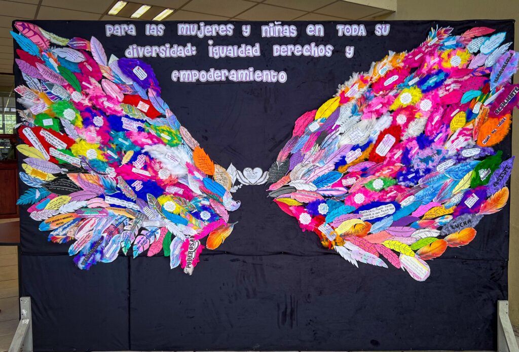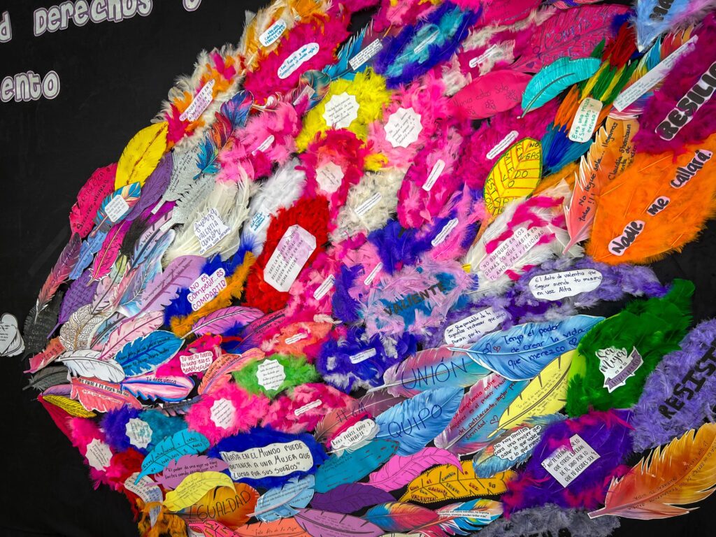 Como parte de estas acciones, se realizó un mural de alas que simboliza la prevención de la violencia, promoviendo un mensaje de empoderamiento y solidaridad entre las mujeres de la comunidad universitaria. A través de este mural, se busca crear conciencia sobre la importancia de construir espacios seguros y libres de violencia dentro y fuera de la institución. La obra representa la diversidad de las mujeres, donde cada una es una pluma que, al unirse, conforma unas alas que simbolizan la libertad y el reconocimiento de todas.