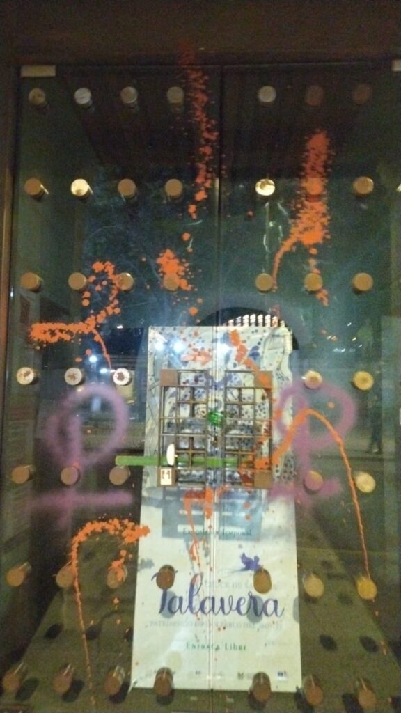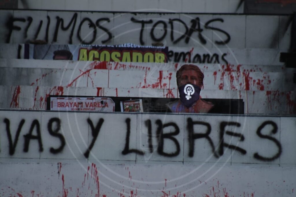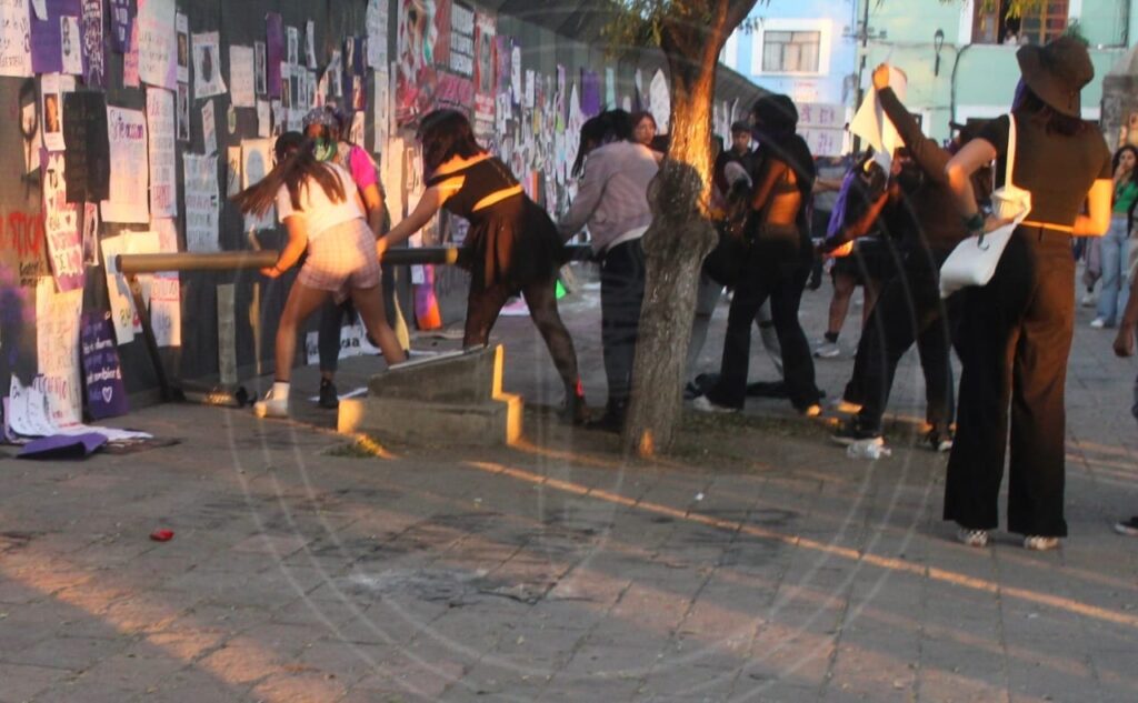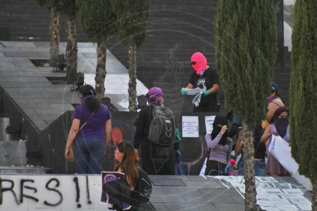 Más tarde, algunas participantes improvisaron fogatas quemando pancartas de la manifestación que arrancaron del kiosko del parque principal, intentaron quemar la puerta del mismo pero no hubo mayor acción.