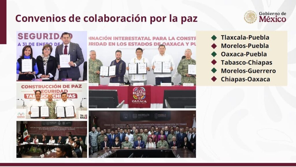 Además, resaltó que la colaboración para la construcción de paz se vio fortalecida con la celebración de convenios interestatales entre Tlaxcala y Puebla, Morelos y Puebla, Oaxaca y Puebla, Tabasco y Chiapas, Morelos y Guerrero, y Chiapas y Oaxaca, en beneficio de la seguridad de las regiones.