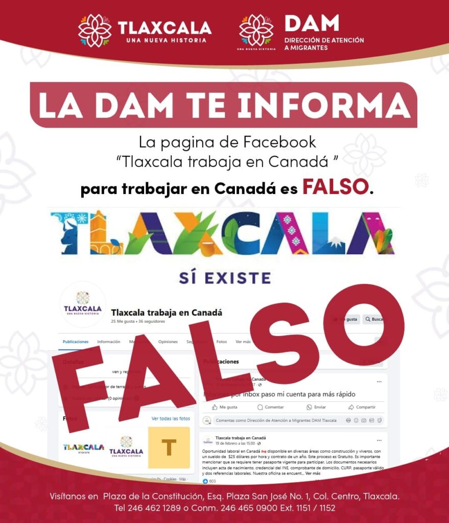 Las páginas que la DAM ha localizado de dudosa procedencia son: Página de Facebook “Tlaxcala trabaja en Canadá”, que ofrece empleo temporal y supuestamente son trabajadores de la Secretaría del Trabajo y Competitividad, solicitan hacer depósitos a cuentas personales, cada vez con mayor cantidad de dinero.