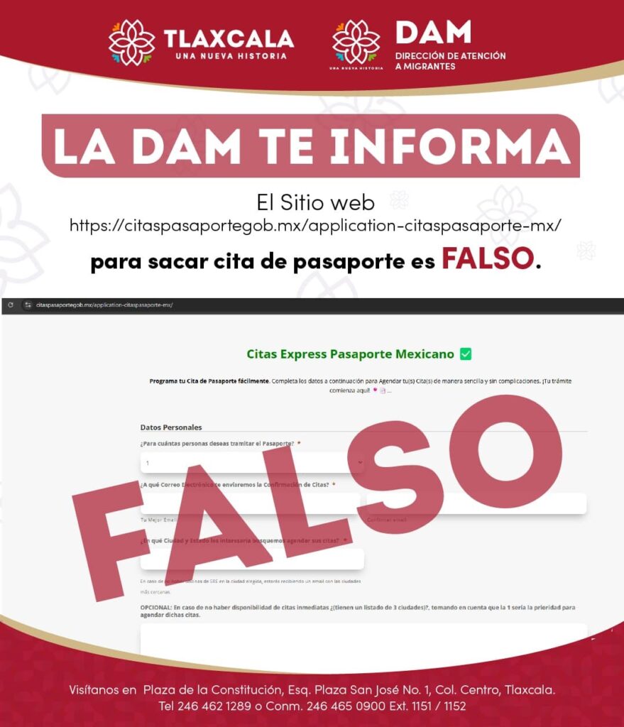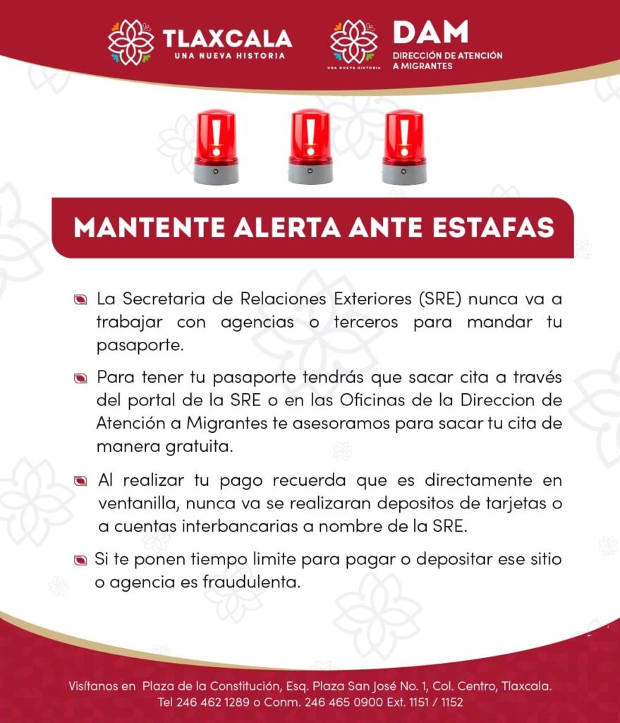 La Dirección de Atención a Migrantes (DAM) detectó páginas falsas que ofrecen empleo temporal en el extranjero y asesoría en servicios migratorios, en las que solicitan cantidades de dinero que piden ser depositados a través de tiendas de conveniencia y transferencias personales, prometiendo la entrega de documentos personalizada, lo que genera incertidumbre, debido a que ningún particular puede expedir documentos oficiales de las instituciones.