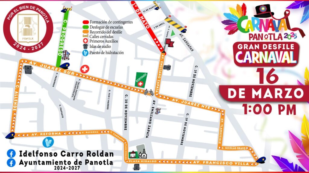 El Ayuntamiento de Panotla, encabezado por el presidente municipal Idelfonso Carro Roldán, invita a toda la ciudadanía y visitantes a disfrutar del tradicional Desfile de Carnaval 2025, que se llevará a cabo este domingo 16 de marzo. Este evento es una de las festividades más esperadas del año, donde la alegría, la cultura y la tradición se hacen presentes en cada comparsa.