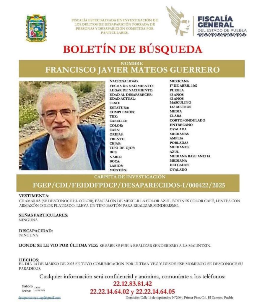 La familia de Francisco Javier Mateos Guerrero, de 61 años, se encuentra en una situación de angustia y desesperación después de que él desapareciera mientras subía a la Malinche el viernes pasado. Según sus familiares, subió a la montaña por San Miguel Canoa y les envió un mensaje de WhatsApp a las 8:10 de la mañana, informándoles que estaba cerca de la cumbre y compartiendo las fotos que acompañan esta publicación.
