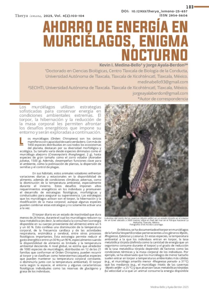En el volumen 4, Núm. 2 de 2025, de la publicación que edita la Asociación Mexicana de Mastozoología A.C., los investigadores de la UATx, los doctores Kevin Ignacio Medina-Bello y Jorge Israel Ayala-Berdón, analizaron las sorprendentes estrategias de supervivencia de los murciélagos.