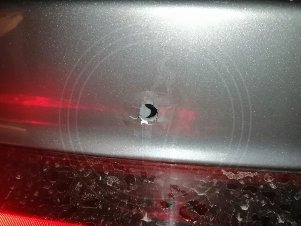 Al intentar esquivar el vehículo, los agresores realizaron detonaciones de arma de fuego contra su auto, un Hyundai gris, el cual presentó al menos dos impactos de arma de fuego.