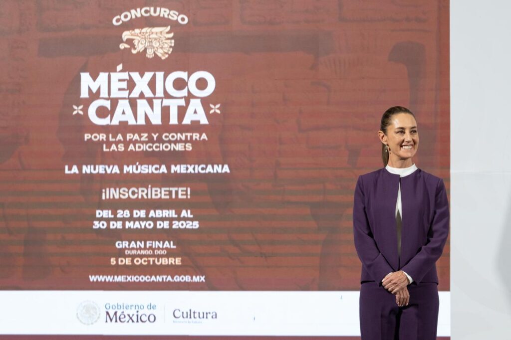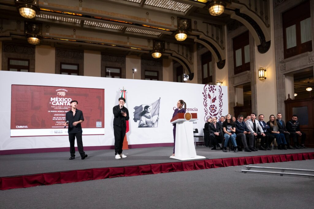La Presidenta Claudia Sheinbaum Pardo convocó a jóvenes mexicanos y estadounidenses a participar en el concurso binacional de música México canta por la paz y contra las adicciones, —cuyas inscripciones serán del 28 de abril al 30 de mayo de 2025— y el cual tiene dos objetivos: promover la música mexicana sin contenidos que hagan apología a la violencia o a las drogas; y, como parte del Plan México, traer al país parte de la industria creativa de Estados Unidos.