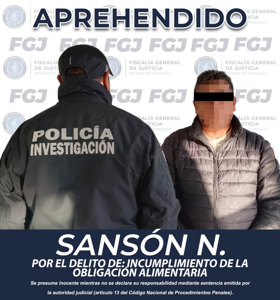 La Policía de Investigación de la Fiscalía General de Justicia del Estado (FGJE) ejecutó una orden de aprehensión en contra de Sansón N., quien sigue su proceso por el delito de incumplimiento de la obligación alimentaria, en agravio de sus tres menores hijas.