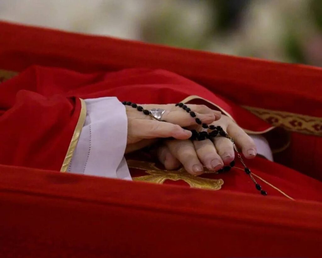 En sus manos, el Papa sostiene un rosario, reflejando su devoción mariana.