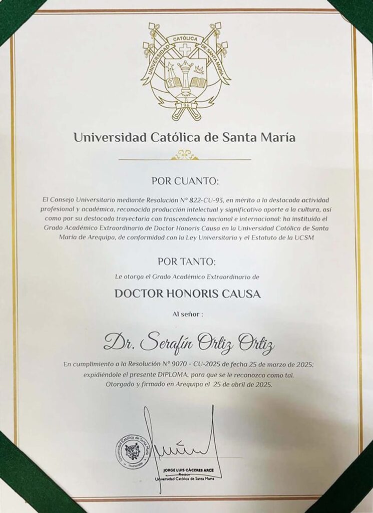 En reconocimiento a su destacada trayectoria intelectual y por sus aportaciones a la educación, la ciencia y la cultura en los ámbitos nacional e internacional, el Doctor Serafín Ortiz Ortiz, Rector de la Universidad Autónoma de Tlaxcala (UATx), recibió el grado académico extraordinario Doctor Honoris Causa que le otorgó la Universidad Católica de Santa María de Arequipa de Perú, el pasado 25 de abril. Presidió esta solemne ceremonia el Doctor Jorge Luis Cáceres Arce, Rector de la Universidad Católica de Santa María, con la asistencia del claustro académico y la comunidad estudiantil.