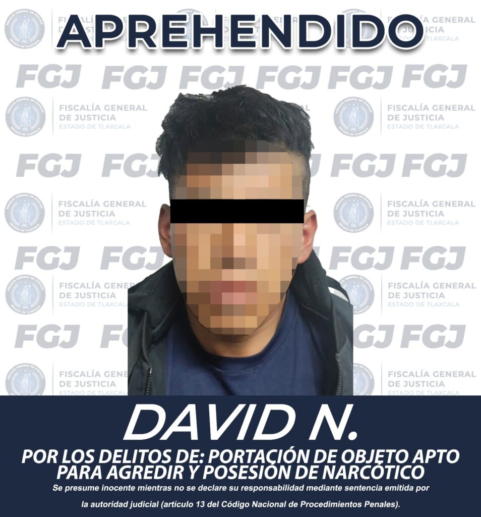 Elementos de la Policía de Investigación adscritos a la Fiscalía General de Justicia del Estado (FGJE) aseguraron, en el municipio de Apizaco, a David N., por los delitos de portación de objeto apto para agredir y posesión de narcótico.