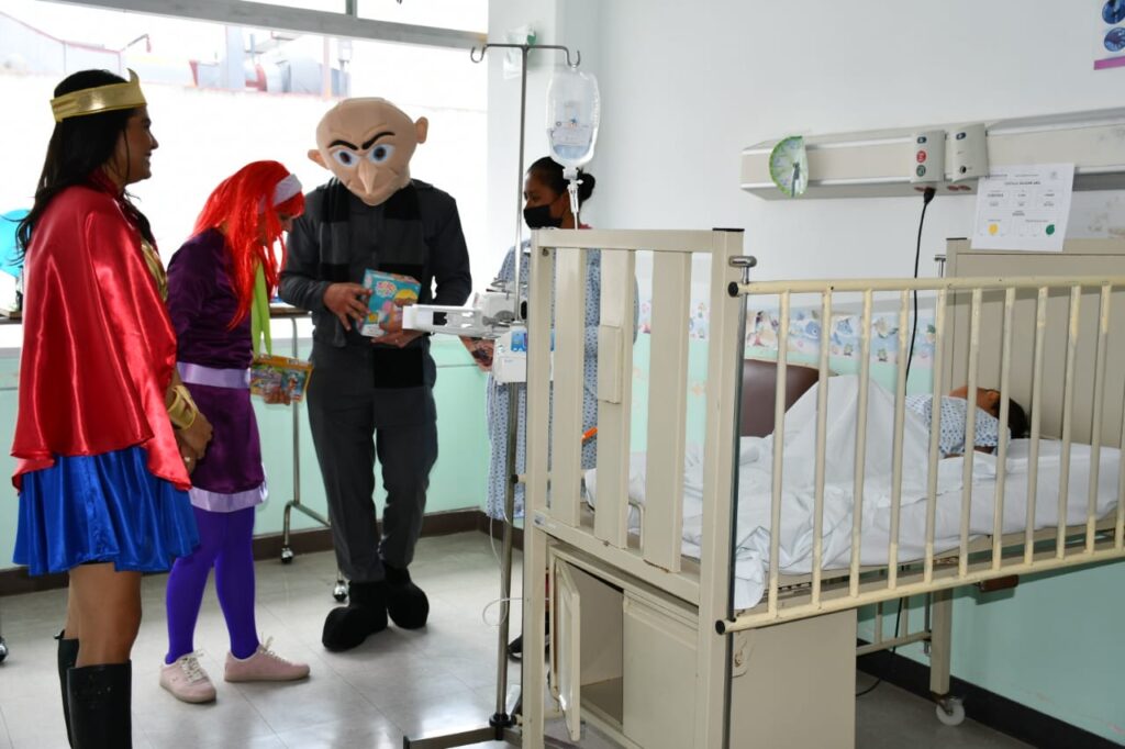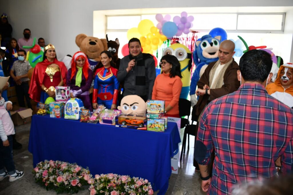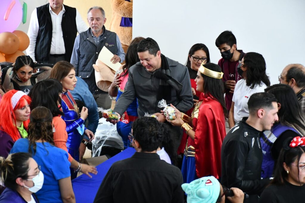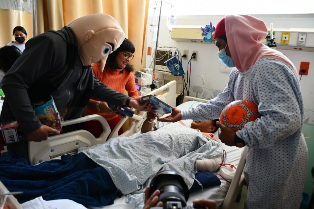 Este 30 de abril, el secretario de Salud, Rigoberto Zamudio Meneses, acompañado de las presidentas honoríficas del Sistema Estatal para el Desarrollo Integral de la Familia (Sedif) y del Comité Consultivo de Bienestar y Desarrollo Social del Estado, Mariana Espinosa de los Monteros Cuéllar y Fernanda Espinosa de los Monteros Cuéllar, respectivamente, recorrieron las áreas de urgencias, hospitalización, consulta externa, oncología y terapia intensiva, para entregar juguetes a las niñas y niños que se encuentra recibiendo atención médica.