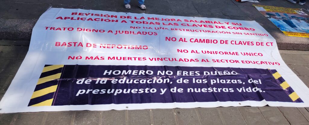Con pancartas, lonas y consignas encendidas, los manifestantes dirigieron un contundente mensaje al titular de la SEP: «Homero, no eres dueño de la educación, de las plazas, del presupuesto ni de nuestras vidas.»