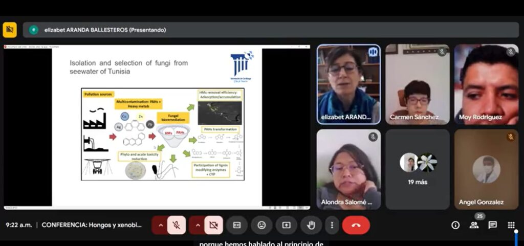 En modalidad virtual, durante su exposición la experta destacó que estos microorganismos pueden adaptarse a sustancias tóxicas conocidas como xenobióticos y ser aprovechados en procesos de biorremediación ambiental, que es la técnica que emplean organismos vivos para limpiar suelos, agua o aire contaminados, contribuyendo así al cuidado del medio ambiente.