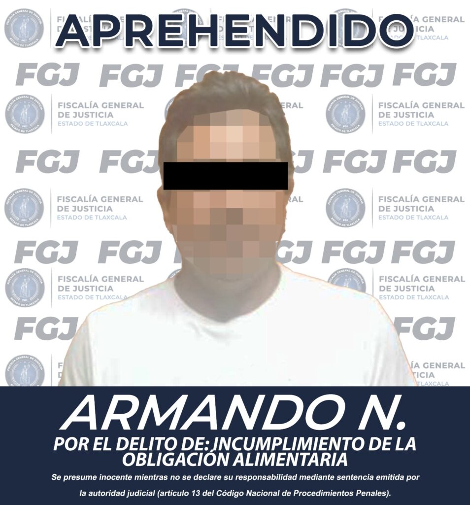En el municipio de Nativitas elementos de la Policía de Investigación de la Fiscalía General de Justicia del Estado (FGJE) ejecutaron una orden de aprehensión en contra de Armando N., por el delito de incumplimiento de la obligación alimentaria, en agravio de su menor hijo.