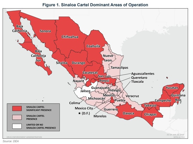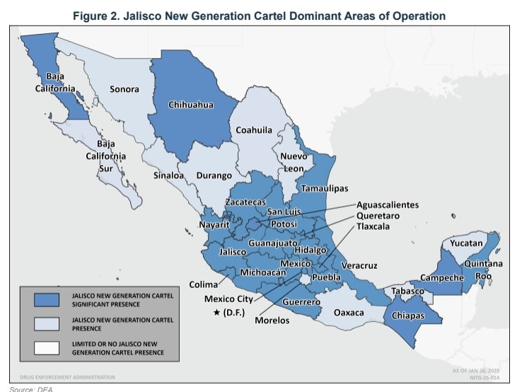 Un reciente informe de la Administración para el Control de Drogas (DEA) de los Estados Unidos, titulado «Documento Nacional de Evaluación de la Amenaza de las Drogas (NDTA) 2025», ha revelado la presencia y actividades de diversos grupos delincuenciales organizados en México como el Cártel de Jalisco Nueva Generación (CJNG), así como el Cártel de Sinaloa.