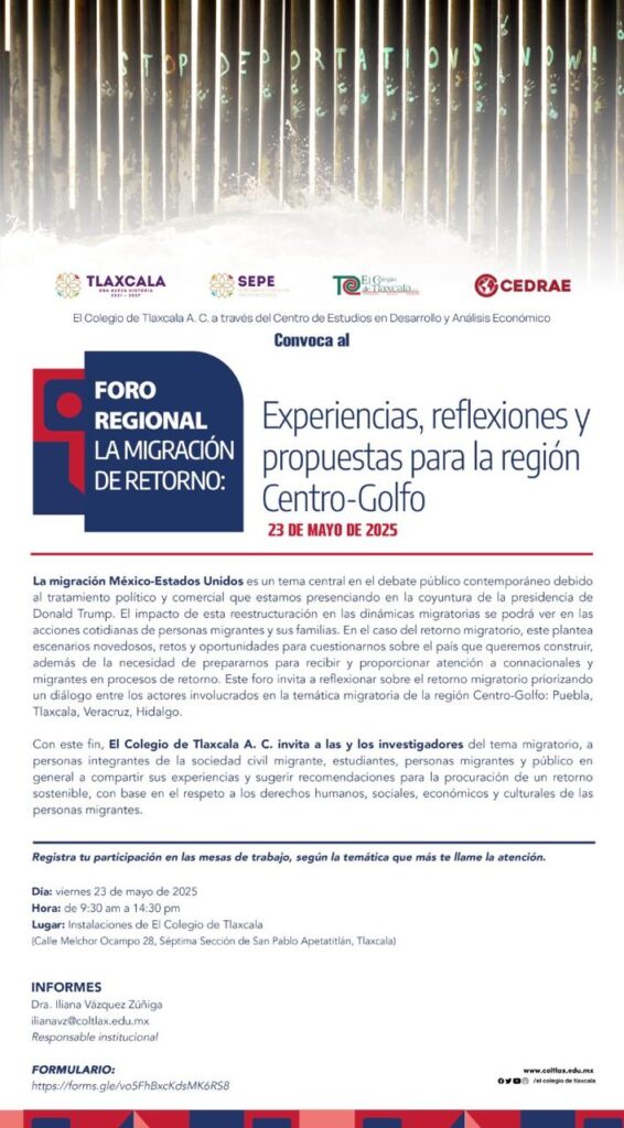 El Colegio de Tlaxcala, A.C., a través de su Centro de Estudios en Desarrollo y Análisis Económico, convoca a investigadores, integrantes de la sociedad civil migrante, estudiantes, personas migrantes y público en general, a participar en el Foro sobre Migración de Retorno, que se llevará a cabo el 23 de mayo de 2025 en sus instalaciones.