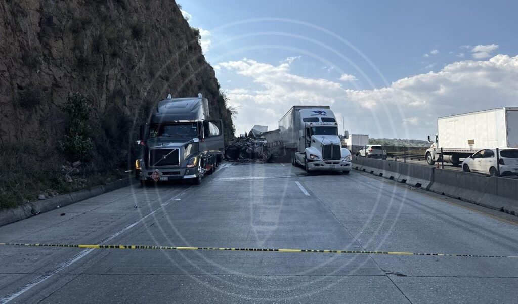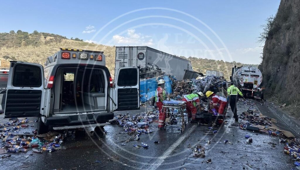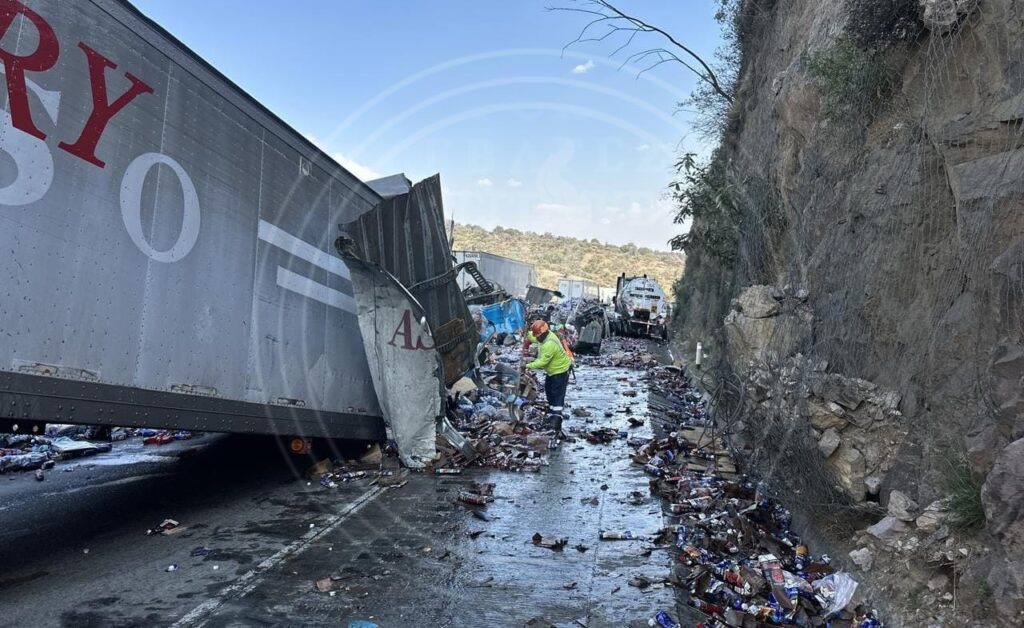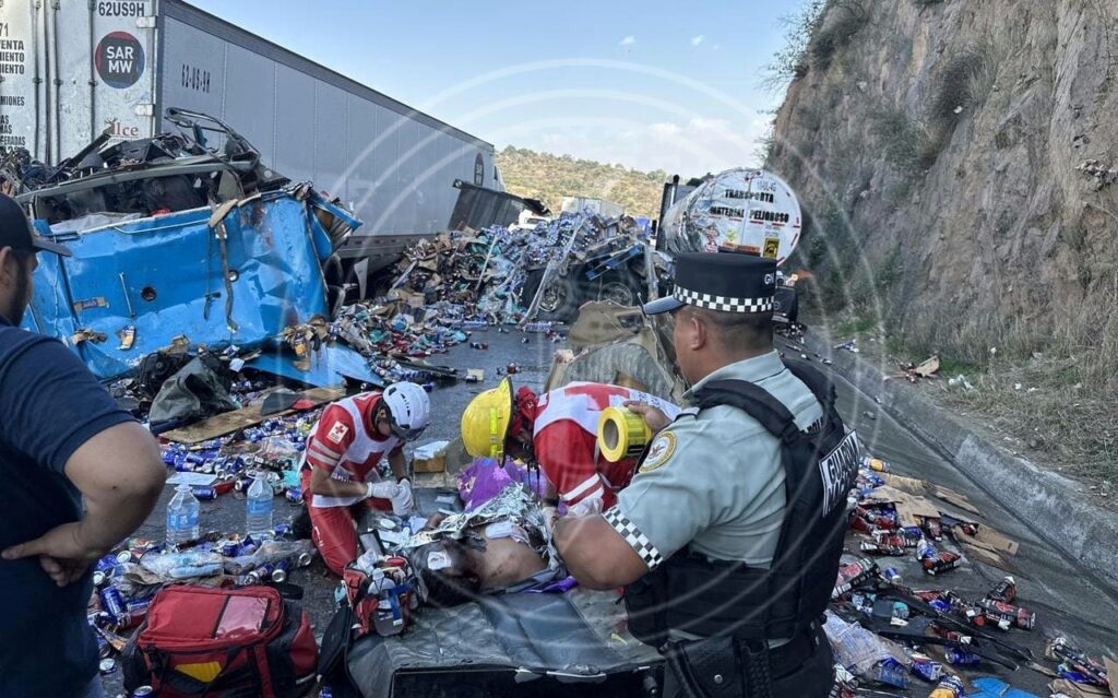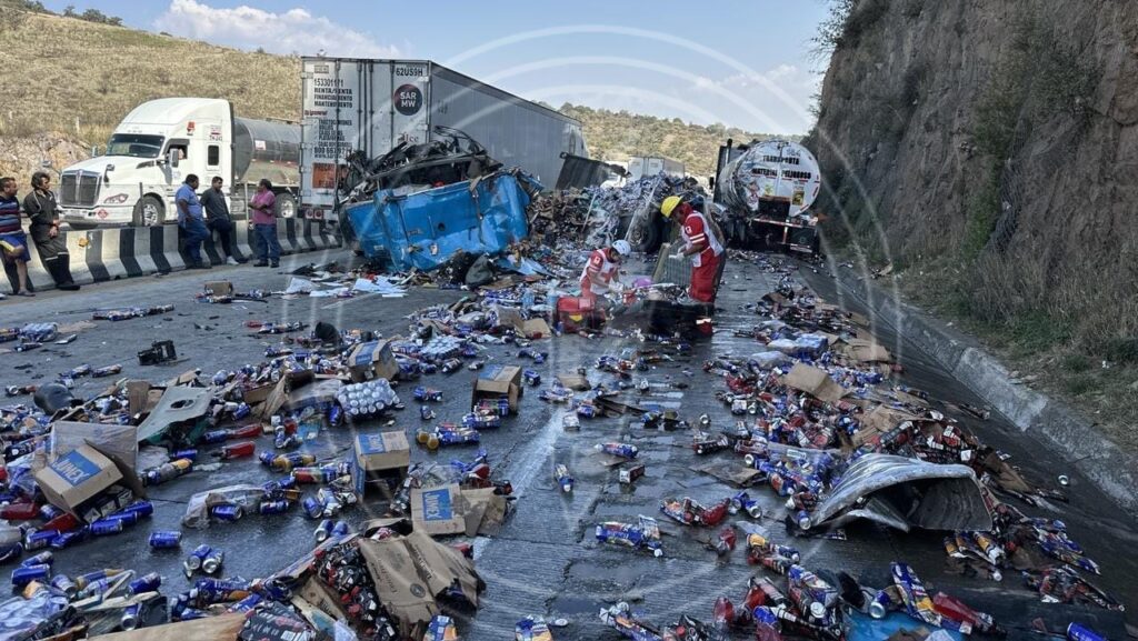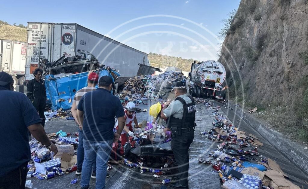 Al menos 10 vehículos se vieron involucrados en el accidente, incluyendo un tráiler con cabina azul y caja seca cargada con botellas de jugo, donde viajaban los ahora fallecidos.