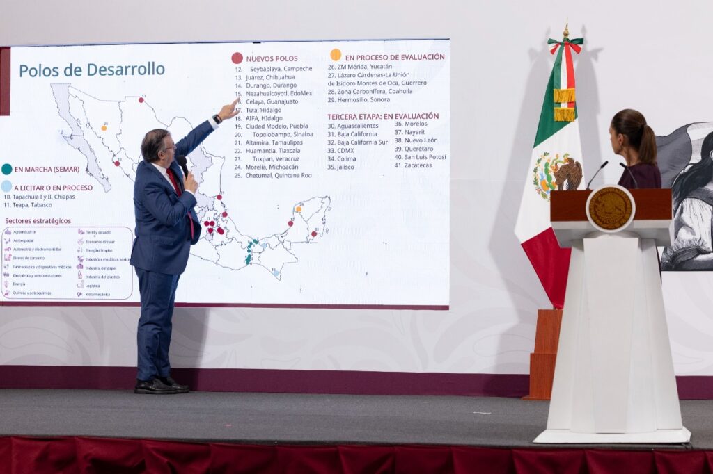 Al mostrar el mapa de PODEBIS autorizado por la presidenta Sheinbaum, Marcelo Ebrard informó que 14 nuevos polos fueron aprobados por el Comité Intersecretarial y los gobiernos de las entidades federativas, los cuales “ya se están licitando, concursando, invitando al sector privado”.