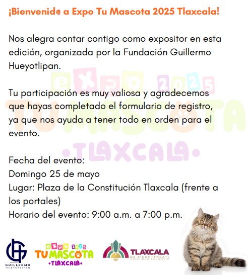 El Ayuntamiento de Tlaxcala, en colaboración con la Fundación Guillermo Hueyotlipan, invita a la ciudadanía a participar en la Expo Tu Mascota 2025, un evento que promueve el respeto, cuidado y bienestar de los animales de compañía, a realizarse este domingo 25 de mayo en la Plaza de la Constitución de la capital, de 9:00 a.m. a 7:00 p.m.