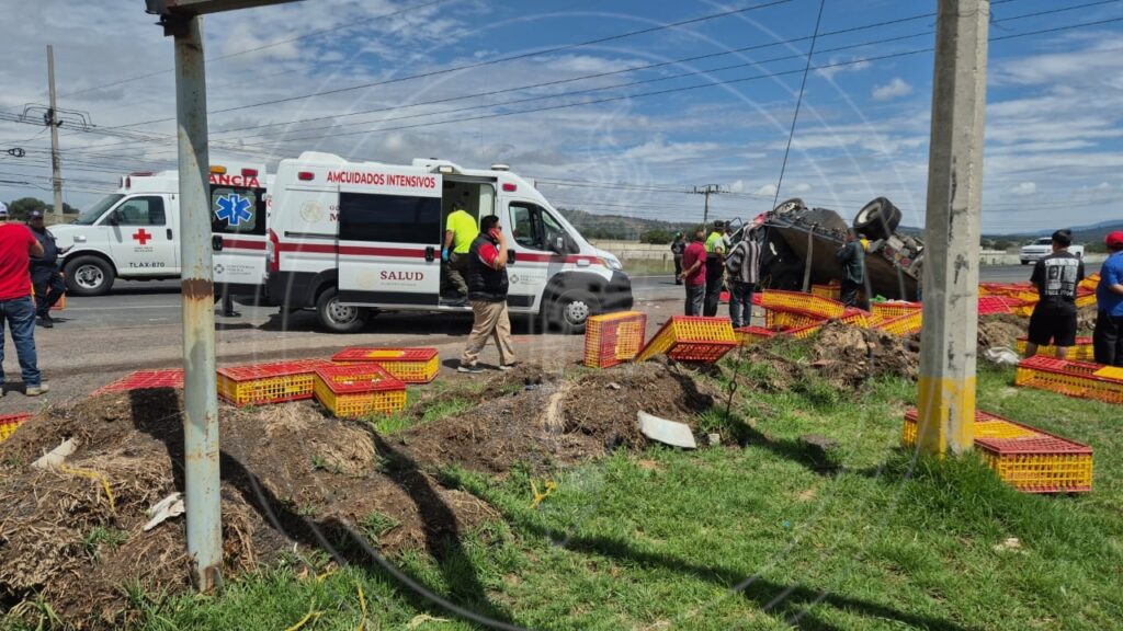 Volcadura de camión repartidor de pollo en Tetla deja tres lesionados