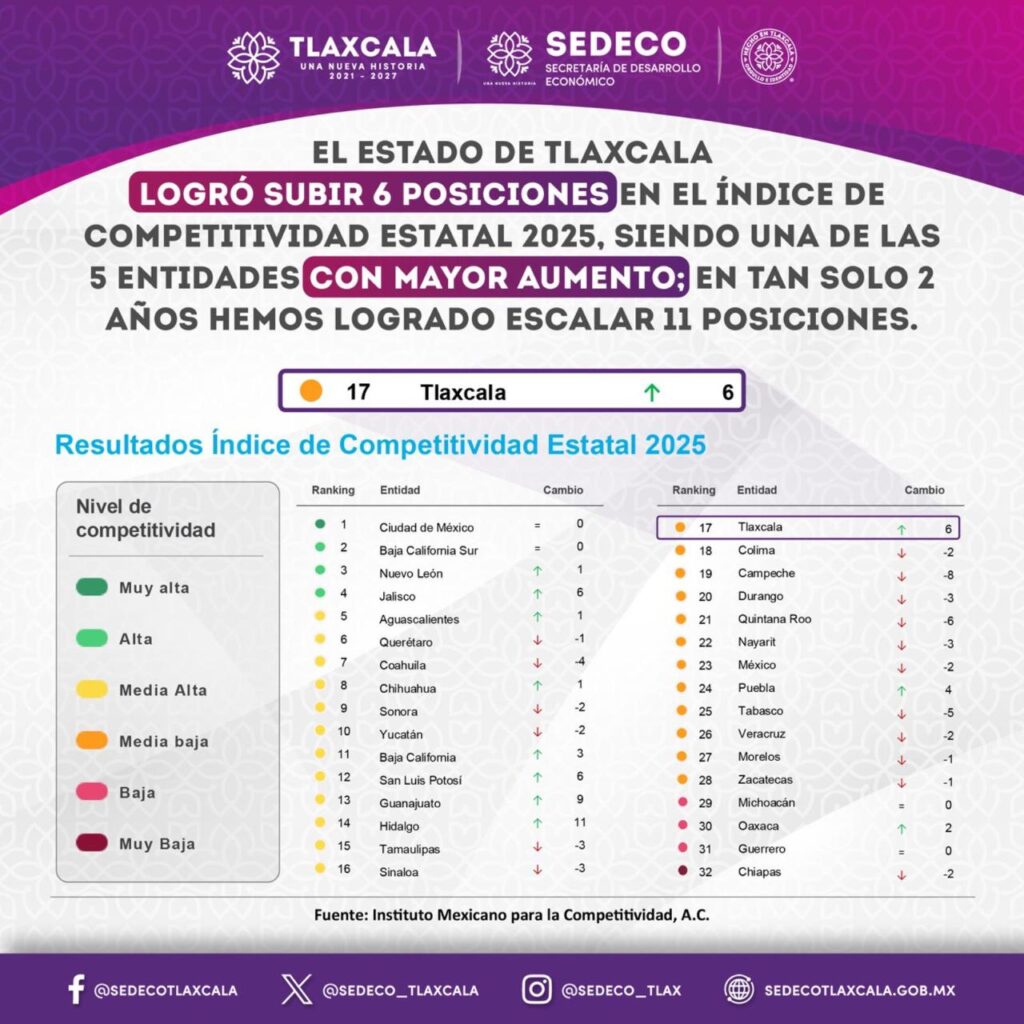 Tlaxcala fue uno de los 11 estados del país que subió posiciones en el Índice de Competitividad Estatal (ICE) 2025, publicado por el Instituto Mexicano para la Competitividad (IMCO), debido a que mejoró su desempeño en los indicadores que miden la capacidad estructural para generar, atraer y retener talento e inversión.