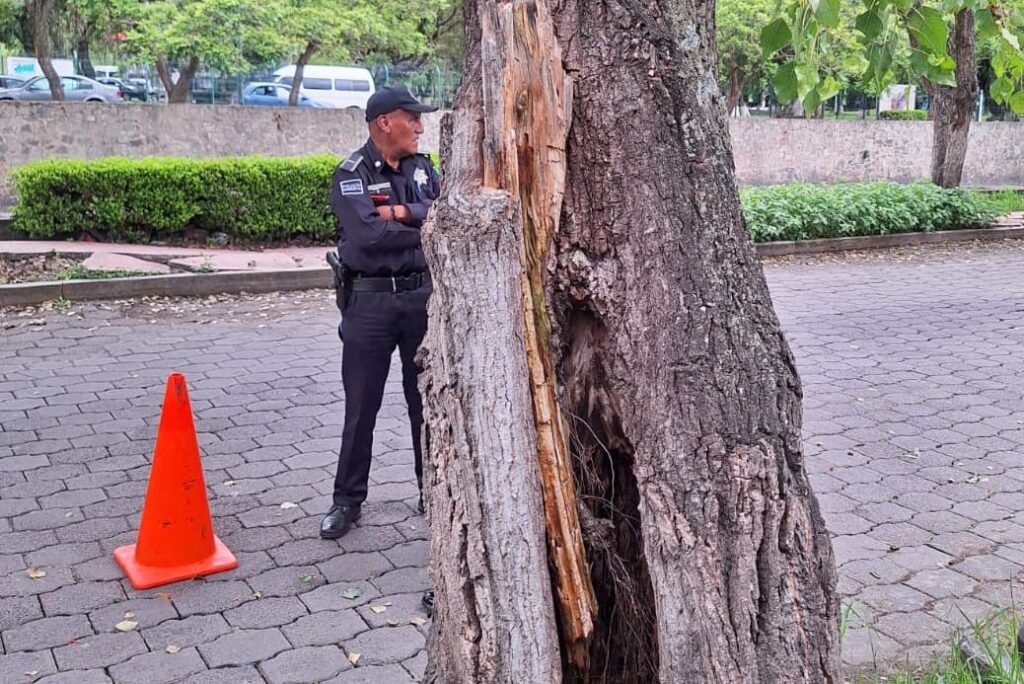 La acción se realizó tras una evaluación técnica del Departamento de Ecología, el cual dictaminó que el árbol, ubicado en el Bulevar Leonarda Gómez Blanco, a la altura del Instituto Municipal de la Mujer, presentaba un avanzado estado de descomposición interna, lo que comprometía su estabilidad y representaba un peligro potencial en caso de caída, especialmente ante los actuales fenómenos climatológicos.
