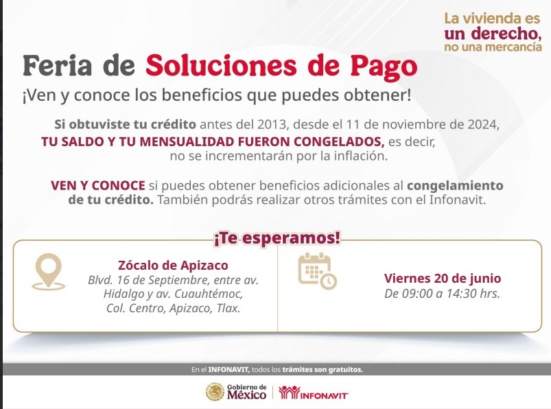 La atención se brindará el viernes 20 de junio, de 09:00 a 14:30 horas, en el zócalo de Apizaco, ubicado entre avenida Hidalgo y Cuauhtémoc, colonia Centro.