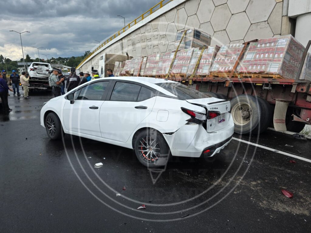 Una aparatosa carambola se registró esta tarde en la carretera Apizaco-Tlaxcala, a la altura del Distribuidor Vial «El Molinito», en correspondencia con el municipio de Apetatitlán cuando un tráiler con doble semirremolque cargado con losetas embistió a por lo menos nueve vehículos.
