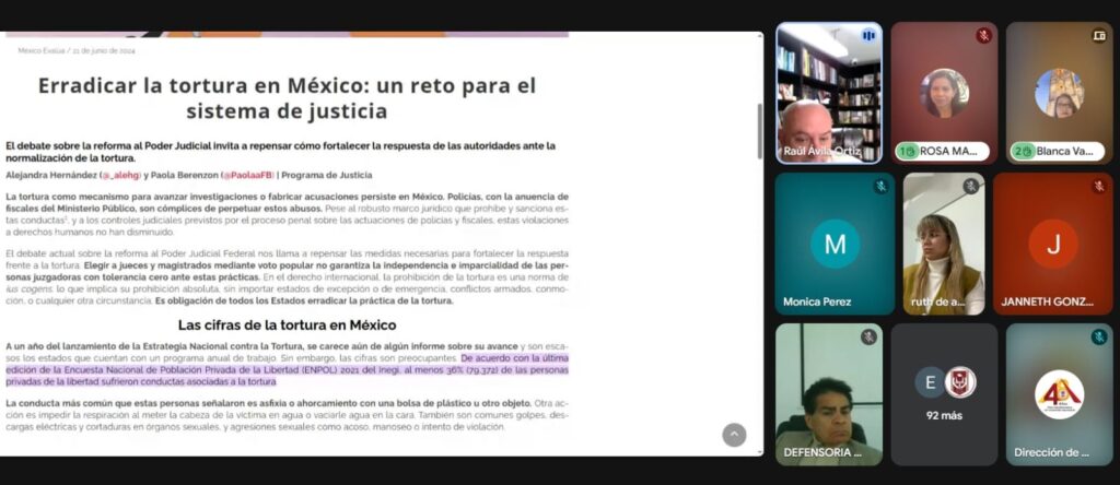 Al finalizar, el investigador nacional compartió una serie de recomendaciones para reducir la tortura en México, entre ellas: fortalecer las acciones de prevención, capacitar de forma continua a las instancias juzgadoras, y mejorar la eficacia e integridad del sistema de justicia penal.