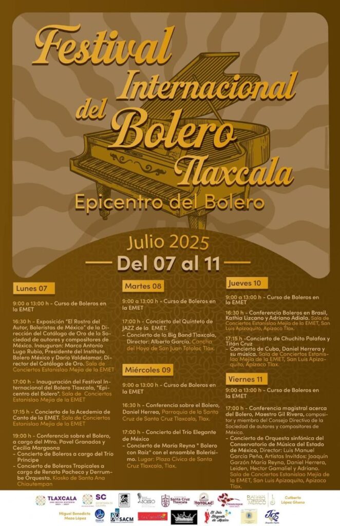 La Secretaría de Cultura (SC) anunció el Primer Festival Internacional del Bolero, que se llevará a cabo, del 7 al 11 de julio, en Tlaxcala bajo el lema “Epicentro del Bolero”, con el objetivo de honrar, preservar y proyectar uno de los géneros musicales más emblemáticos de América Latina.