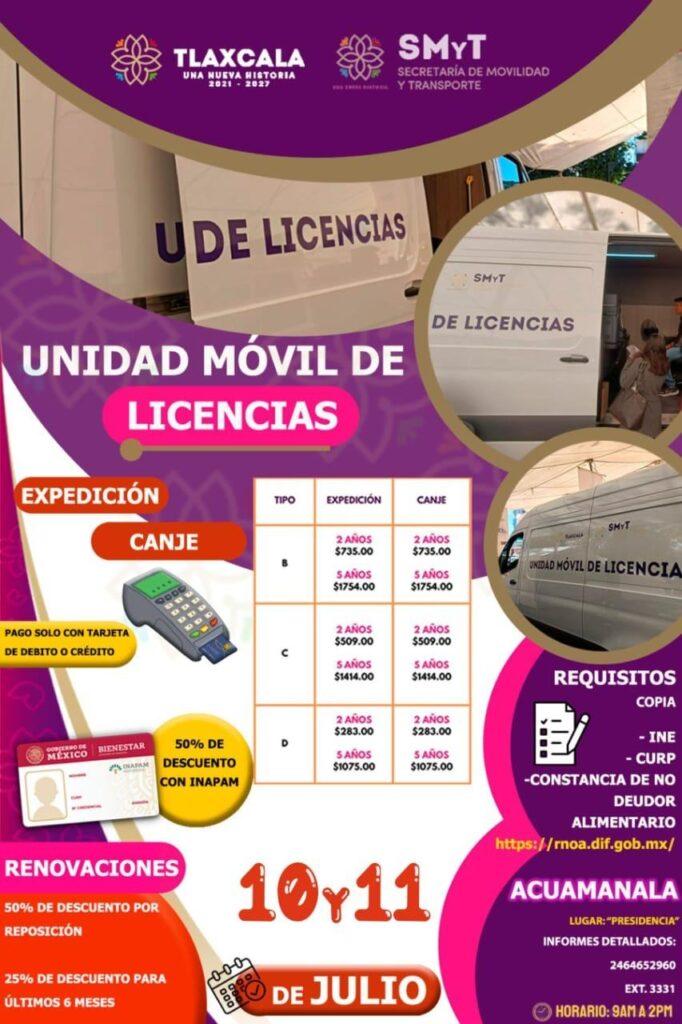 La Secretaría de Movilidad y Transporte (SMyT) dio a conocer que los días 10 y 11 de julio, la Unidad Móvil de Licencias estará brindando atención a la ciudadanía en Acuamanala, con el objetivo de acercar los servicios y trámites que ofrece a comunidades y municipios que no cuentan con una delegación de la dependencia estatal.