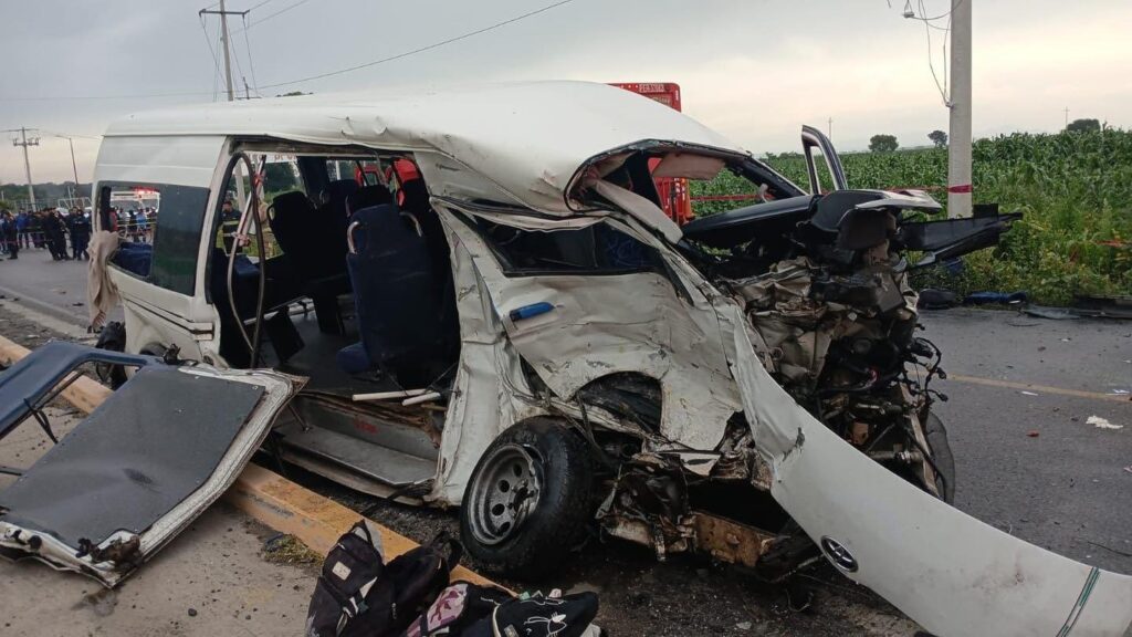Según los primeros reportes, el choque frontal se registró cerca del entronque carretero de San Nicolás Buenos Aires. La unidad de transporte, presuntamente una combi o una unidad de transporte de personal de la línea Discroll con placas del estado de Tlaxcala, colisionó de frente contra el camión de carga.