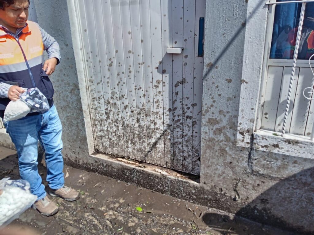 En la unidad habitacional Santa Cruz, ubicada junto al río de Los Negros, en el municipio de Chiautempan se atendieron 12 viviendas afectadas. Las brigadas entregaron 24 frascos de plata coloidal, 24 pastillas de hipoclorito de calcio y 24 impresos con recomendaciones de fomento sanitario.