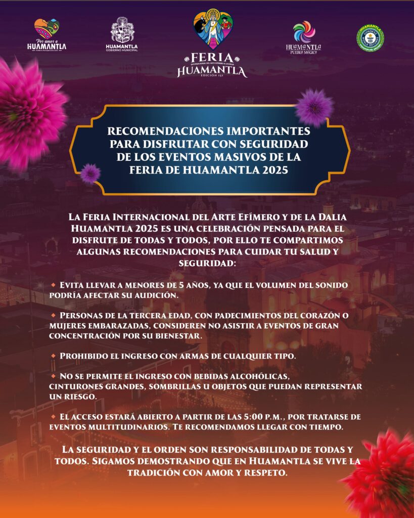 Con el objetivo de garantizar la seguridad, el orden y la sana convivencia durante los eventos de gran afluencia en el marco de la Feria Internacional del Arte Efímero y de la Dalia Huamantla 2025, el Gobierno Municipal, a través de la Dirección de Seguridad Pública, Tránsito y Protección Civil, emite una serie de recomendaciones para todas y todos los asistentes: