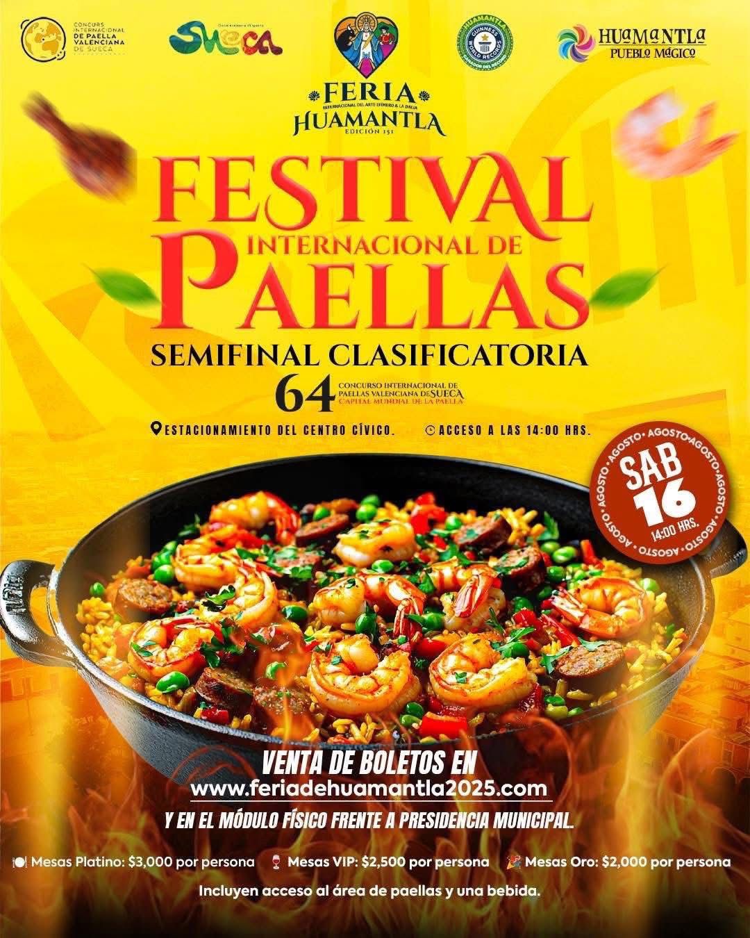 El Gobierno Municipal de Huamantla informa que los boletos Platino para el esperado Festival de Paellas ya están agotados. Solo quedan disponibles localidades en las zonas VIP y General para disfrutar de este evento único en el marco de la Feria Internacional del Arte Efímero y la Dalia 2025.