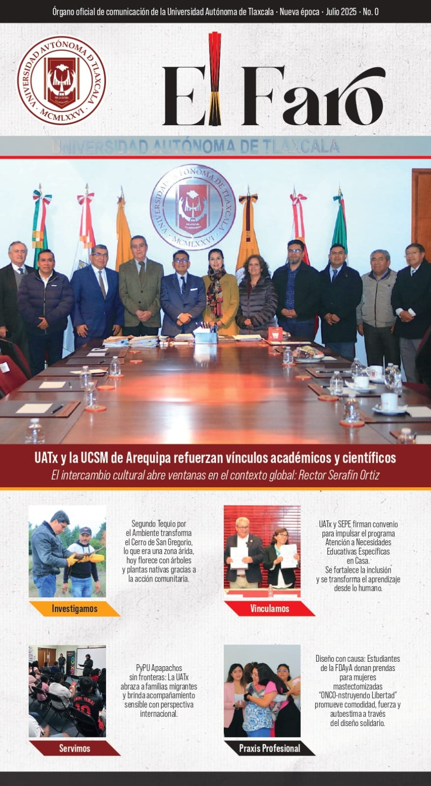 Para mantener informada a la comunidad universitaria y a la sociedad en general de las acciones que emprende la Universidad Autónoma de Tlaxcala (UATx) en sus funciones sustantivas de docencia, investigación, extensión de la cultura y autorrealización, el Rector, Doctor Serafín Ortiz Ortiz, entregó en la sesión del H. Consejo Universitario el periódico “El Faro”, en su nueva época.