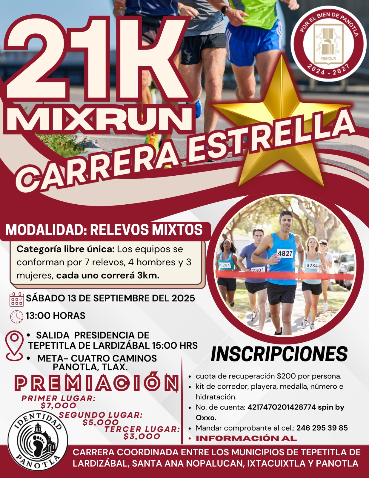 El H. Ayuntamiento de Panotla, que encabeza el presidente municipal Idelfonso Carro Roldán, en coordinación con los municipios de Ixtacuixtla, Tepetitla de Lardizábal y Santa Ana Nopalucan, invita a la ciudadanía a participar en la Carrera Estrella 21K Mix Run, una de las competencias deportivas más esperadas y que se ha convertido en una tradición para la región.
