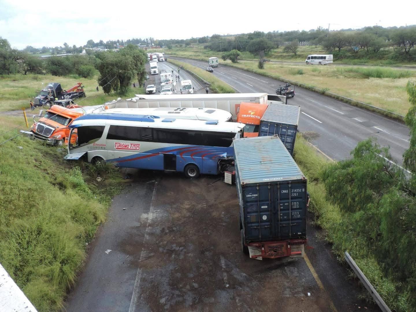 Un aparatoso accidente múltiple en la Carretera Federal 45 Norte, en el estado de Aguascalientes, a la altura de San Francisco de los Romo, dejó un saldo de más de 30 personas lesionadas, con al menos cuatro de ellas en estado de gravedad. El siniestro, ocurrido durante la mañana del sábado 6 de septiembre, involucró a dos tráileres, dos autobuses de pasajeros y una camioneta de transporte de personal.