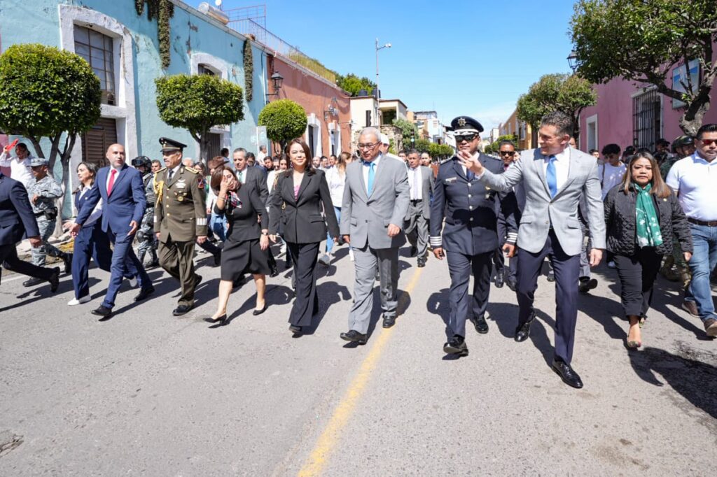 Luego se unió al presídium oficial, encabezado por la gobernadora, desde donde aplaudió el paso de contingentes escolares, militares y de seguridad pública, desfile en el que destacó la presencia de los elementos de la Dirección de Seguridad, Protección Ciudadana y Movilidad de la capital.