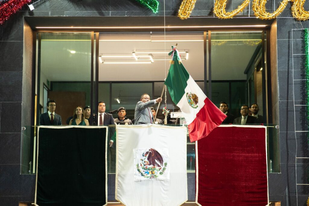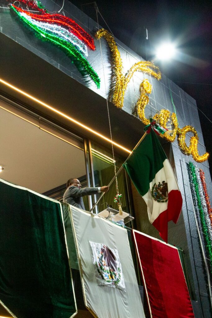 Desde el balcón de la presidencia municipal, acompañado de su esposa, Anabel Monter Ríos, y de sus hijos, ondeó con emoción la Bandera Nacional y recordó con respeto a los hombres y mujeres que participaron en la lucha por la independencia.