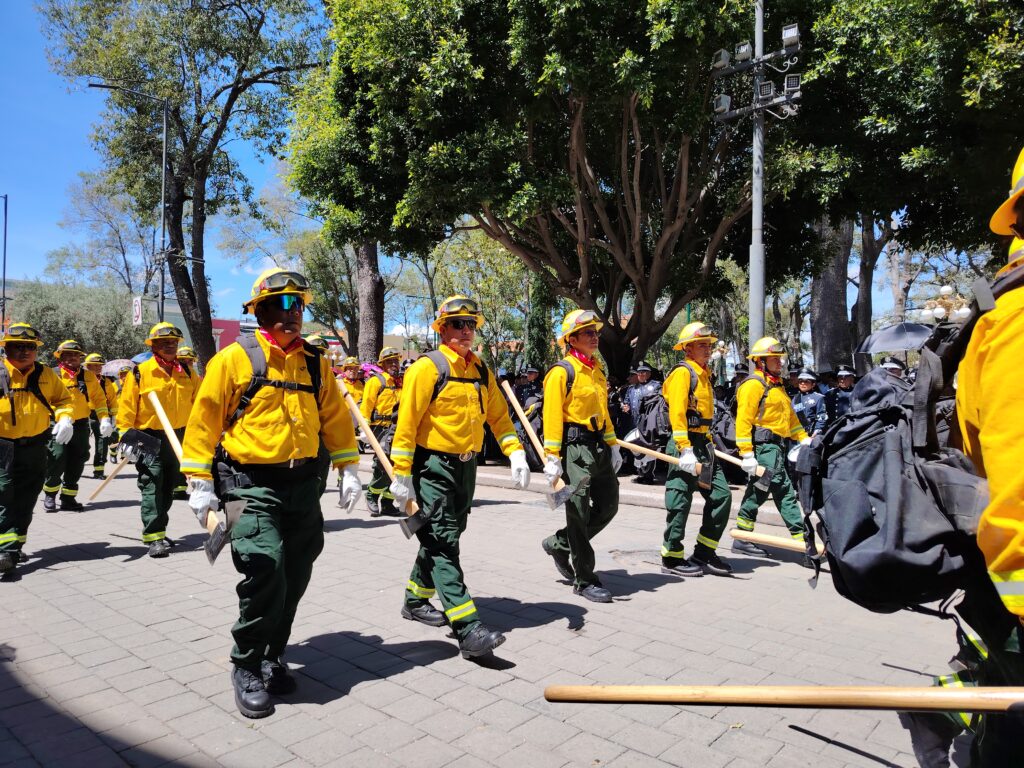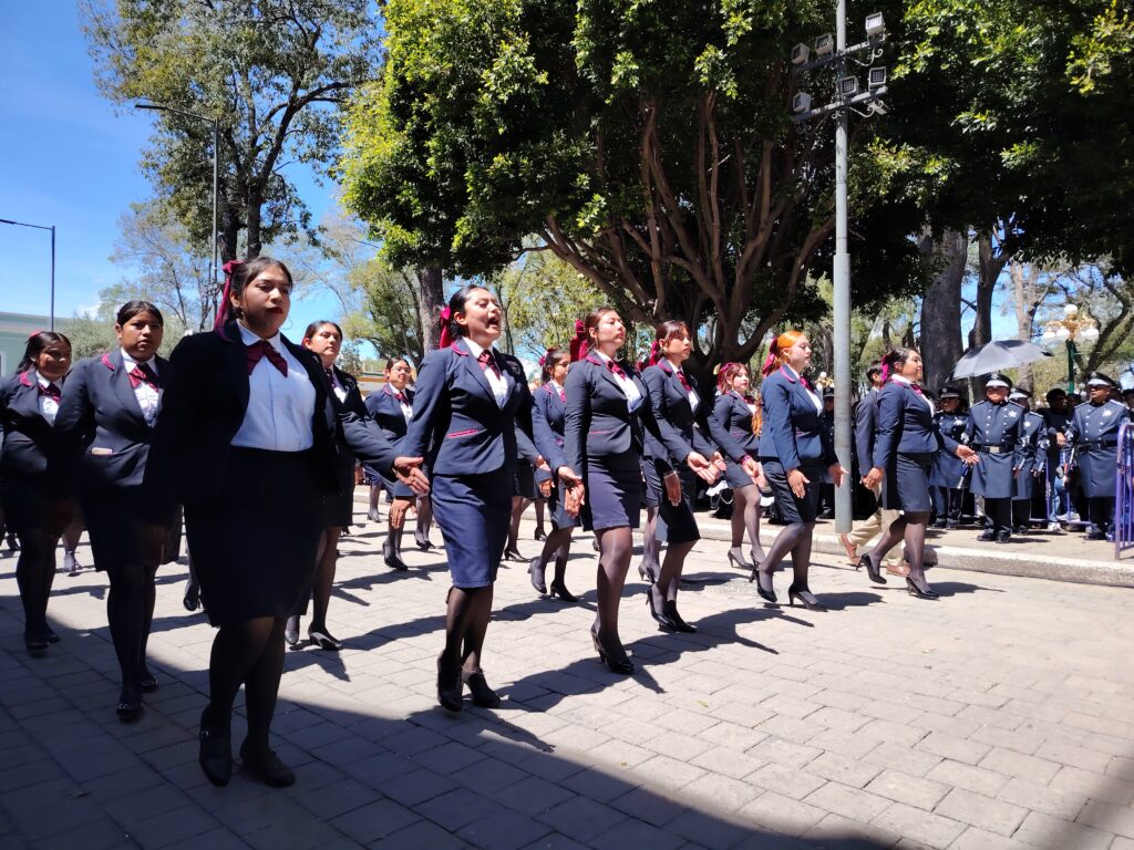 Autoridades estatales, fuerzas armadas, instituciones educativas y cuerpos de auxilio participaron en el desfile celebrado en el Zócalo de la capital tlaxcalteca.