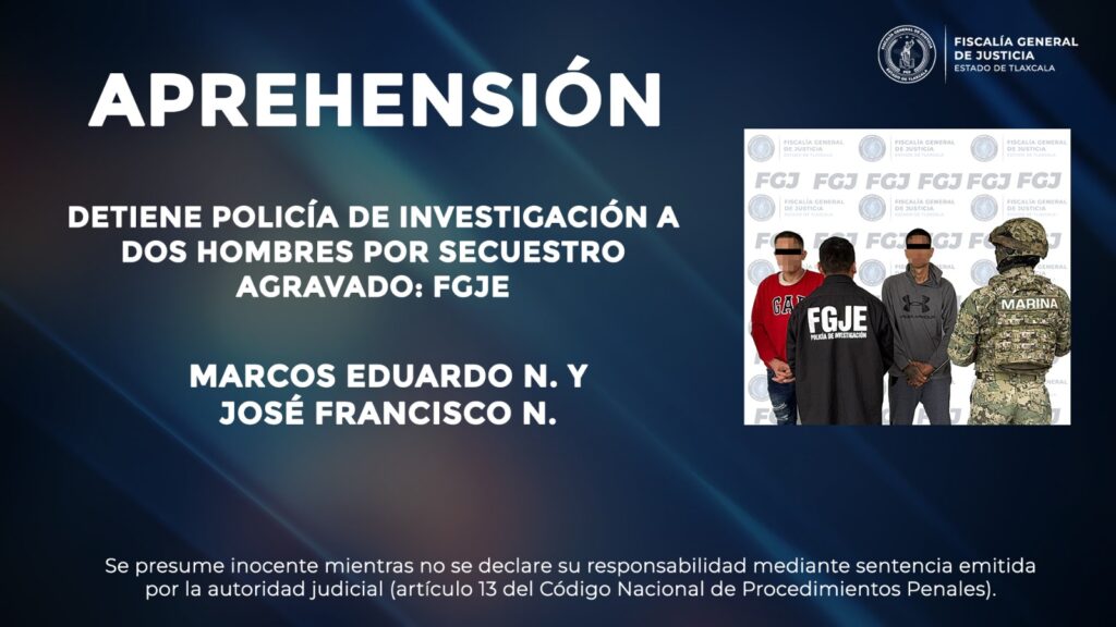 Como resultado de una acción operativa basada en trabajos de inteligencia, la Policía de Investigación de la Fiscalía General de Justicia del Estado (FGJE) logró la detención de Marcos Eduardo N. y José Francisco N., por el delito de secuestro agravado, ocurrido el 18 de mayo de 2025 en el municipio de Tetla de la Solidaridad.